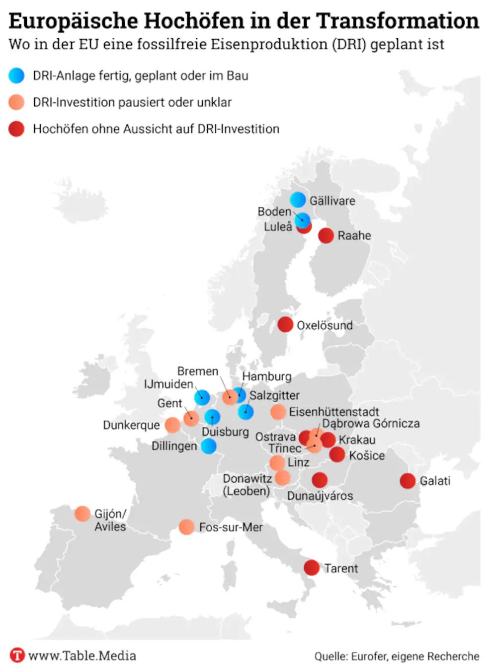 🏭 Wasserstoff im Mobilitätsbereich ist eine Sackgasse. In der Produktion von Neustahl ist die Sachlage anders. Chemisch lässt sich die derzeit dort verwendete Kohle kaum anders ersetzen. Bezahlbarer grüner Stahl bleibt das Ziel. Bei Table Media habe ich eine schöne Karte gefunden, die zeigt, welche europäischen Stahlwerke gerade ihre Produktion umstellen – oder die Umstellung auf Eis gelegt haben. Auf 12,5 Millionen Tonnen Gesamtproduktion kommen die derzeit geplanten Projekte.