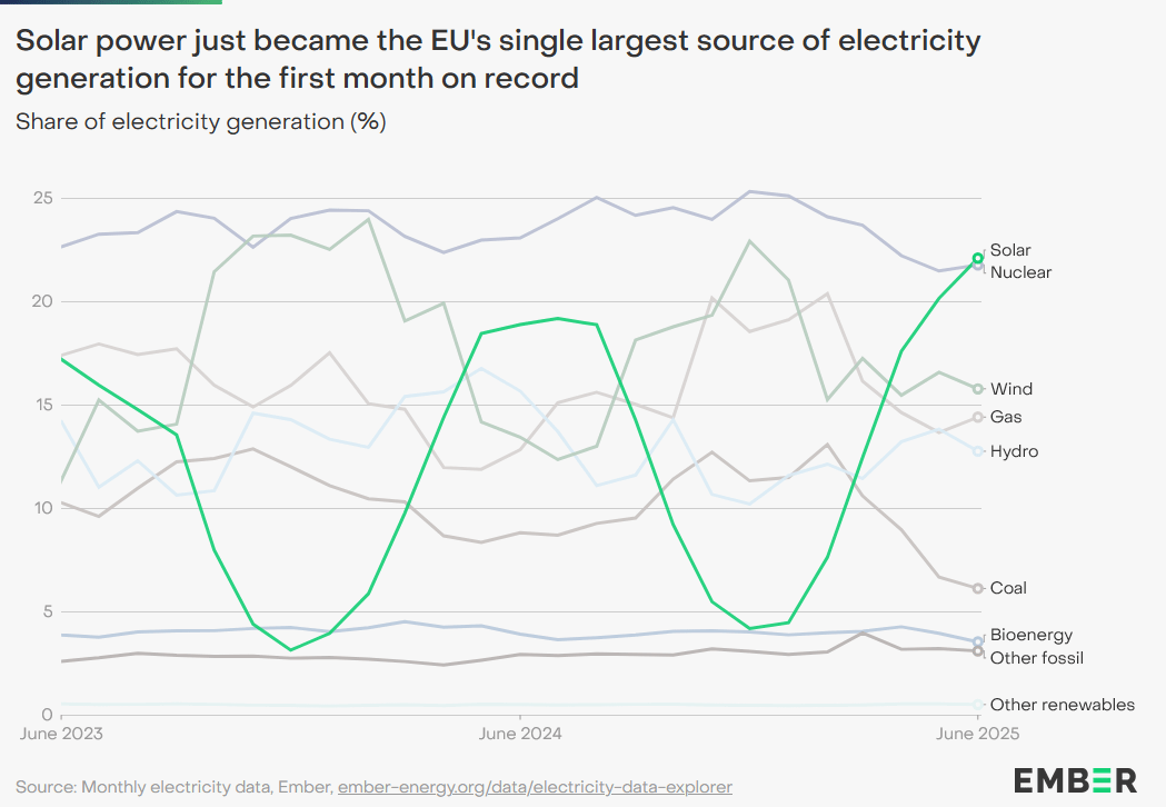☀ 🇪🇺 Beginnen wir mit einer historischen Meldung. Im Juni produzierte keine andere Energieform so viel Strom in der EU wie Solarkraft. Das war eine Premiere.