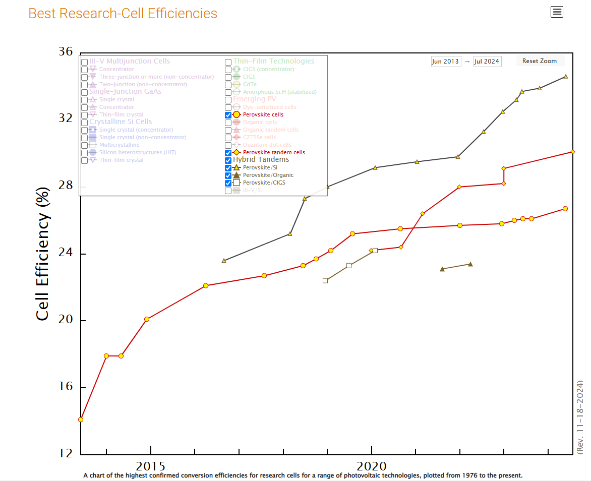 Diese Grafik zeigt dir, wie sich die Wirkungsgrade von Perowskit-Solarzellen in den vergangenen Jahren entwickelt haben.