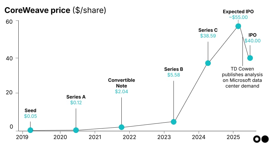 Coreweave baut KI-Rechenzentren und vermietet sie. Die Firma ging gerade an die Börse, aber zu deutlich niedrigeren Preisen als erwartet. $40 pro Aktie statt bis zu $55: