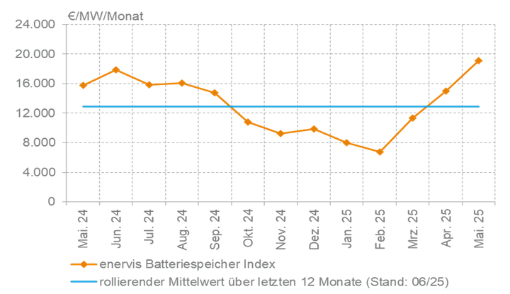 Wie es gerade am Markt aussieht: Neue Zahlen aus dem Enervis-Batteriespeicherindex zeigen, dass seit Beginn der Berechnung vor gut zwei Jahren noch nie so viel Geld mit Speichern verdient werden konnte wie heute. Im Mai 2025 sind die erzielbaren Erlöse auf rund 19.100 Euro pro Megawatt gestiegen – 22 Prozent mehr als im Vorjahr.